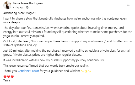 I love all of Cendrines offerings. They are so inclusive for every kind of learner. By the end of the 3 months journey, my frequency definitely rose and now feel I’m building on a more expanded, powerful foundation. So grateful for Cendrine, her team and my own Angelic divine family.